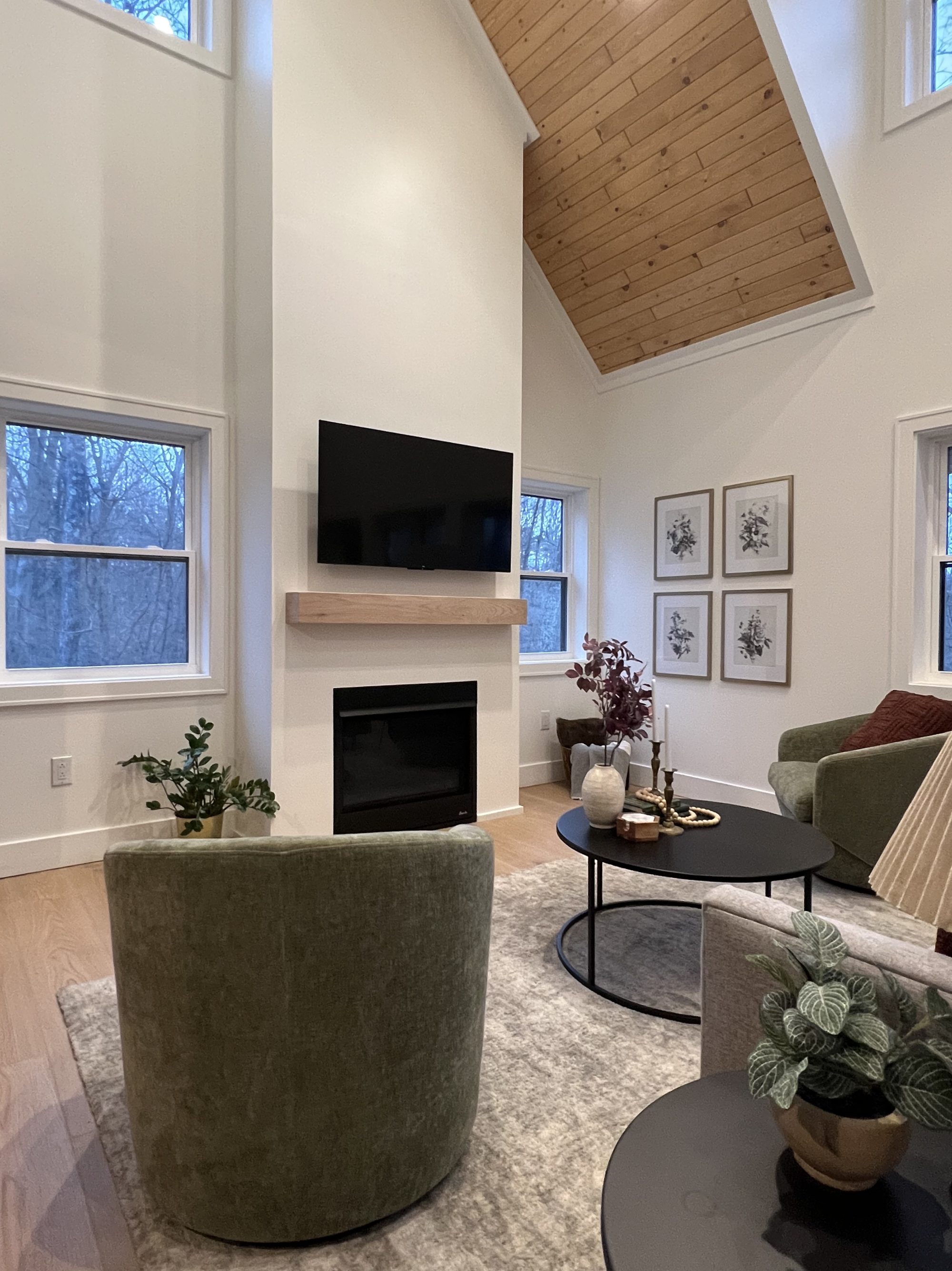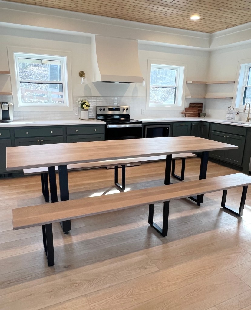 The Monroe is equipped with a ramp to enter, an accessible fire pit area, a main floor suite with ADA compliant bed height, a zero entry shower, grab bars by the commode and in the shower, wheelchair accessible bathroom sink base, lever sink handles, and level door handles. The dining table in the kitchen was designed by ADA compliant height and leg room requirements.